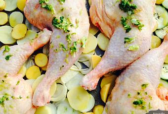 En una bandeja de horno ponemos los muslos de pollo, que habremos pincelado de aceite generosamente, por encima le echamos el zumo del limón.