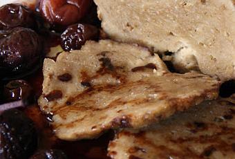 Mezclamos en un bol el vino afrutado (apartamos las frutas para decorar después el asado), con un chorrito de aceite y otro de salsa de soja.Cogemos la bola de seitán y la ponemos en una bandeja de horno. Le rociamos por encima un poco de la salsa de vino y ponemos el resto en una salsera.Metemos el seitán al horno unos 15 minutos a fuego medio-fuerte. Lo sacamos y cortamos parte en rodajas. Lo colocamos en una fuente y lo rociamos con un poco más de salsa. Decoramos con las frutas desecadas, con la salsera para servirse al gusto./