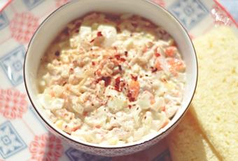 Ingredientes:- 1 huevo cocido.- 5 palitos de cangrego (surimi).- 1 cebolleta fresca.- 1 lata de atún en conserva (yo utilicé una lata de atún al natural).- 1 cucharadita de vinagre.- 3 cucharadas de mayonesa (si es casera mejor).- Pimentón en escamas para adornar.- Pan o tostas.