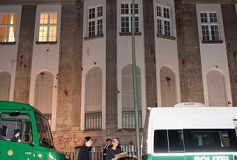 En los aledaños de la embajada había otro grupo de manifestantes que tiraron pintura a la fachada del edificio.