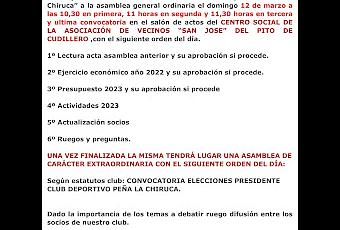 El DOMINGO 12 DE MARZO LOS SOCIOS DEL CLUB DEPORTIVO BASICO PEÑA LA CHIRUCA , tienen una cita en el LOCAL SOCIAL DE LA ASOCIACION DE VECINOS "SAN JOSE" EN EL PITO (CUDILLERO) para realizar la asamblea general ordinaria, para presentar según estatutos, el estado económico del club, así como presupuestos , aprobación de los mismos y actividades.Y como también dicen los estatutos, toca celebrar elecciones a la presidencia del club, por lo que una vez acabada la asamblea general ordinaria ,comenzara una asamblea extraordinaria, para debatir dicho punto.