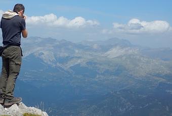 Vista de la cima de la Peña MontañesaEl camino desciende en dirección a la Canal Mayor y continúa, más adelante, rodeando la cima de la Peña Montañesa por su cara sur. Después giramos al este para afrontar la subida final por una pedrera con más pendiente. Los últimos metros se hacen duros. En la cima de la Peña Montañesa hay un punto geodésico y una pirámide metálica. La mejor recompensa son las fabulosas vistas del Pirineo aragonés. Descansamos un buen rato en la cima antes de iniciar el retorno por el mismo camino.