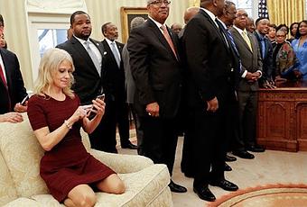 En una imagen tomada por un fotógrafo de la AFP, Conway aparece de rodillas sobre un sofá de la oficina presidencial con el celular en la mano mientras que Trump posa para una foto con los líderes negros de colegios y universidades.