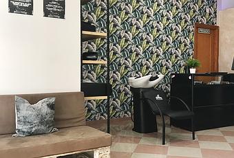 La zona de recepción y lavacabezas es donde esta la pared con el papel tropical, y como es de bonito el papel eh. Fíjate que es una zona que destaca mucho y es donde esta el punto clave, la recepción, es la primera y la última imagen que ve por el cliente, siempre tiene que irse con una buena impresión, por eso es importante.
