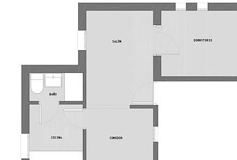 Aquí podéis ver el estado inicial del apartamento. Cuando tenemos espacios pequeños, en la medida de lo posible es mejor abrir los espacios, haciendo que un mismo espacio compartan diferentes usos. Inicialmente en este apartamento, teníamos una cocina, un dormitorio, un comedor y el salón, cada una de estas estancias eran independientes unas de otras.
