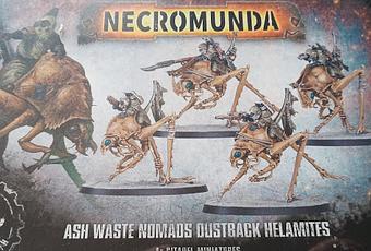 La caja la componen dos matrices idénticas, de unas cuarenta piezas cada una con las que montar cuatro Ash Waste Nomads Dustback Helamites, 4 peanas ovaladas de 75 mm (Como las que usan las motos y la caballería) y las instrucciones en forma de folleto en blanco y negro, que son dos folios grapados por la mitad haciendo un folleto e impresos por ambas caras.