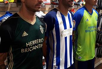 Las tres equipaciones son en cuello de pico con el cuello y las franjas laterales en dorado. La tercera en colores verde y azul, la segunda en negro y verde oscuro y la primera en los tradicionales colores blanquiazules, entallada y con un aire vintage, recordando a las equipaciones de los años 70. La publicidad frontal de Herrero Brigantina es más pequeña y con un diseño más acertado, la parte posterior viste la marca valcarcel.