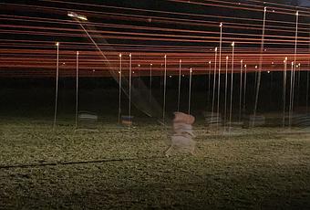De día, la sombra es la protagonista fundiéndose en el atardecer. De noche, la luz toma su relevancia inundando la instalación y, por extensión, el Festival.