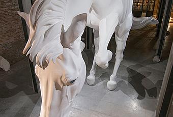 La artista tomó prestados aquellos personajes que tienen un rol pasivo en esa pintura – un caballo blanco y una mujer cautiva – y los puso en acción en su propia instalación, mediante un juego de escalas que expresa las emociones que estos dos personajes intercambian. En un giro contundente, Fontes reemplazó a los jinetes por el edificio mismo del pabellón, junto a todo su contenido histórico. Pero mujer y caballo no están solos en su pathos: 400 rocas amenazantes, un joven y una sombra completan la escena.