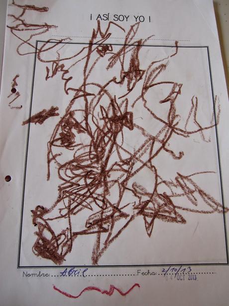 En este trabajo también se ve la evolución en la escritura de su nombre. No me detengo tanto en esta entrada porque ya analicé esas fases en otra que se llama "Etapas del aprendizaje de la escritura" y en el vídeo del mismo nombre.
