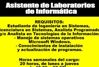 Principales tareas a desarrollar:Brindar servicios en el área de Laboratorios, tales como:- Control y supervisión de la seguridad del equipamiento informático y mobiliario de laboratorios y salones.- Instalación de los sistemas operativos y software necesarios para el dictado de los cursos.- Apoyo a los estudiantes ante problemas técnicos en el equipamiento de los laboratorios.- Soporte técnico a docentes en salones de clases y laboratorios.- Administración del sistema de impresión, impresión de trabajos para docentes y personal administrativo, y control del stock de insumos.- Asistencia a nivel técnico y de operador en eventos organizados por la facultad.