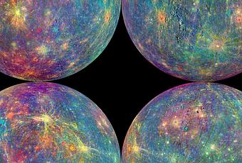 La atmósfera de Mercurio y la composición de la superficie espectrómetro de la nave espacial (MASCs) captura cientos de longitudes de onda de la luz, muchos invisibles para nosotros. Estas longitudes de onda se convierten luego en rojo, verde y azul para resaltar tanto las diferencias físicas y químicas en la superficie del planeta, como los minerales, cráteres y respiraderos piroclásticos.