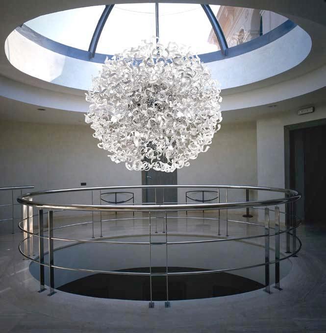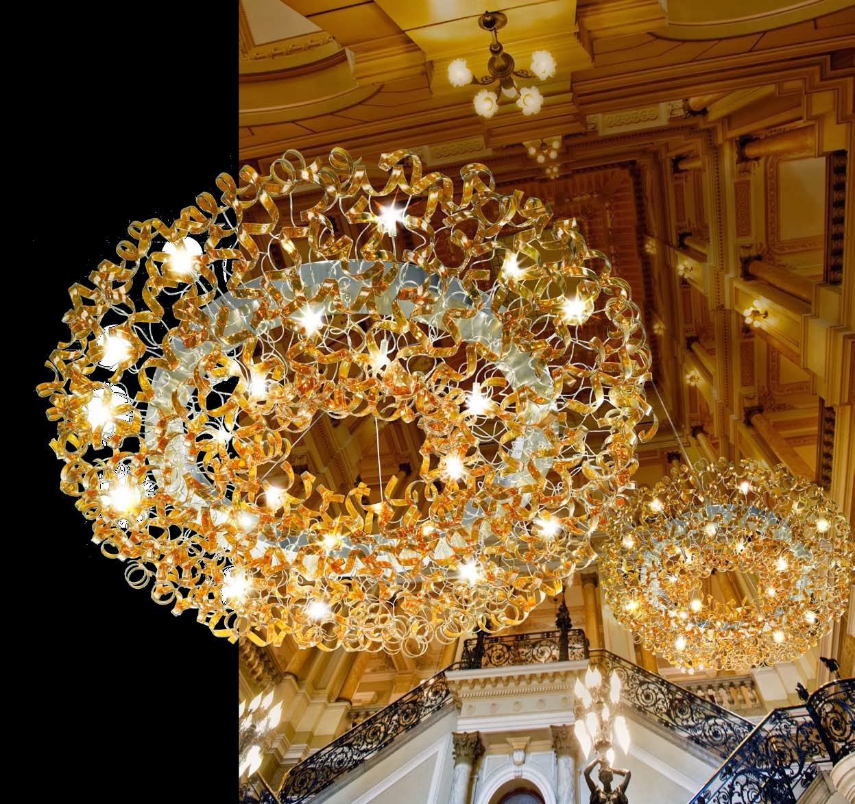 Se ve claramente que la forman cristales a modo de rizos en colores a gusto del cliente, bien en monocolor o bicolor y las alturas de las lamparas pueden ajustarse a nuestras necesidades al igual que su tamaño: