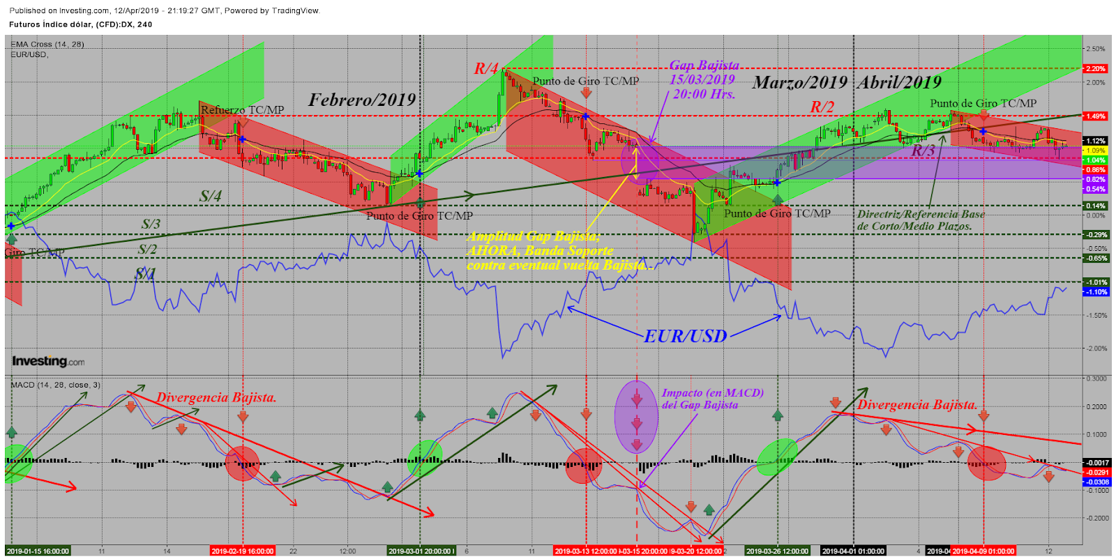 -Directrices y Canales: Al Cierre de la Semana 15/2019 La Acción del Precio del Index Dollar (DXY) se encuentra en un punto intermedio de un Canal Bajista de Corto Plazo correspondiente a un nuevo Patrón de Cambio de Tendencia en Canal de Alcista a Bajista... aunque la Acción del Precio se ha mantenido, en cierto sentido, LATERALIZANDO cierta Recuperación Alcista anterior, de Corto/Medio Plazos, ya ha vuelto a perder la Directriz Base Alcista de Corto/Medio Plazos. La Banda de Precios correspondiente al anterior Gap Bajista (del 15/03/2019) se mantiene como una Franja Soporte contra un eventual regreso a la Tendencia Bajista de Corto Medio/Plazos... -Soportes y Resistencias:El Soporte que ha detenido la actual vuelta Bajista de La Acción del Precio está situado en el Entorno Nivel (actual) R/3, incluido dentro de la Franja Soporte del anterior Gap Bajista (del 15/03/2019) ...