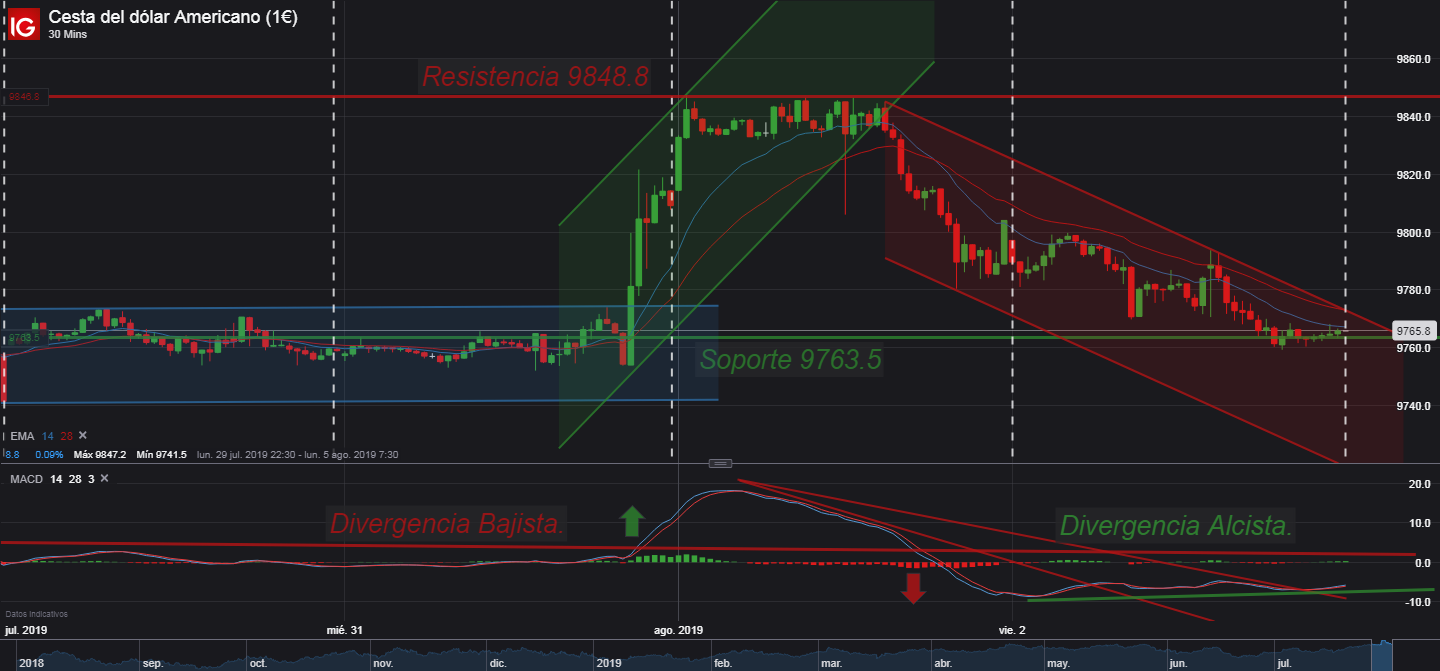 *C- Money Management (Administración del Dinero).------*A- Pronóstico de la Tendencia de Intradía/Corto Plazo Indice Dólar (DXY). Horizonte Temporal de 3 Días a 3 Semanas... Representación Gráfica: Chart de Velas Japonesas de 30 Minutos.*Aspectos del Análisis Técnico Gráfico a tener en cuenta:-Directrices y Canales: Al Cierre de la Semana 31/2019 La Acción del Precio del Index Dollar (DXY) se encuentra moviéndose dentro de un Patrón de Cambio de Tendencia en Canal de Alcista a Bajista de Corto Plazo, en el Techo de dicho Canal...-Soportes y Resistencias:La Resistencia al anterior Movimiento Alcista Semanal está situada en el Entorno Nivel (9848.8); el Soporte actual se encuentra situado en el Entorno Nivel (9763.5) ... *Aspectos del Análisis Técnico Cuantitativo a tener en cuenta:-EMA Cross 14/28: Se encuentra Cortada, al Cierre de la Semana 30/2019, a la Baja...-MACD 14/28/3: El Reflejo de La Acción del Precio se mueve, Cortado al Alza, Bajo el Nivel "0" del Oscilador... Se ha confirmado, al Cierre de la Semana, una Divergencia Alcista en el Oscilador... ---*Testigo Gráfico, Chart de Velas Japonesas de 30 Minutos...: