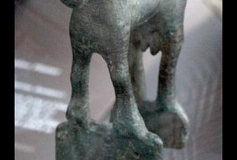 Pequeña escultura en bronce (s. I d.C.) encontrada en la Dehesa Zafrilla de Malpartida de Cáceres. Bajo las patas delanteras se soldó una cartela donde se escribió la dedicación a Ataecina o Adaegina. Actualmente se conserva en el Museo Arqueológico Nacional de Madrid. Foto: J. Vidal. “En el arandel“