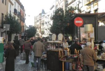 Hoy la calle Feria, es un larguísimo cordón menestral que recorre Sevilla arracimando mercaderías de los más varios pelajes, sede del tradicional Jueves, tiendas galdosianas y librerías de viejo en una serpentina azarosa por donde pululan a primera mañana traperos, comisionistas sin comisión y estudiantes golfos.