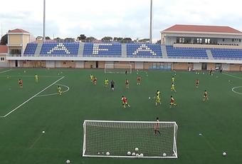 El ejercicio realizado por los jugadores de nuestra Escuela de Fútbol Base requiere precisión en los pases y continuos movimientos en desmarque de apoyo y ruptura buscando la portería adversaria.