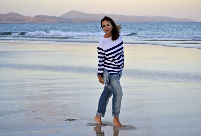 Acabo de regresar de pasar unos días estupendos en el sur de Fuerteventura, un sitio maravilloso que les recomiendo disfrutar si tienen ocasión, normalmente es difícil que no haya viento allí pero los dioses se aliaron en mi beneficio y pude disfrutar del lugar sin él. Estas imagenes fueron hechas al atardecer en la playa de Sotavento, como ven llevo un look de lo más sencillo, rayas marineras en el jersey combinado con unos jeans y cero maquillaje.