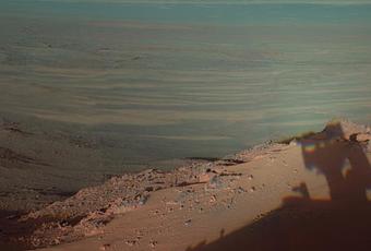 En el momento de tomar la foto el Opportunity estaba teniendo bajo nivel de energía solar debido al invierno marciano. El Opportunity ha estado estudiando el borde occidental del cráter Endeavour desde que llegó allí en agosto de 2011.