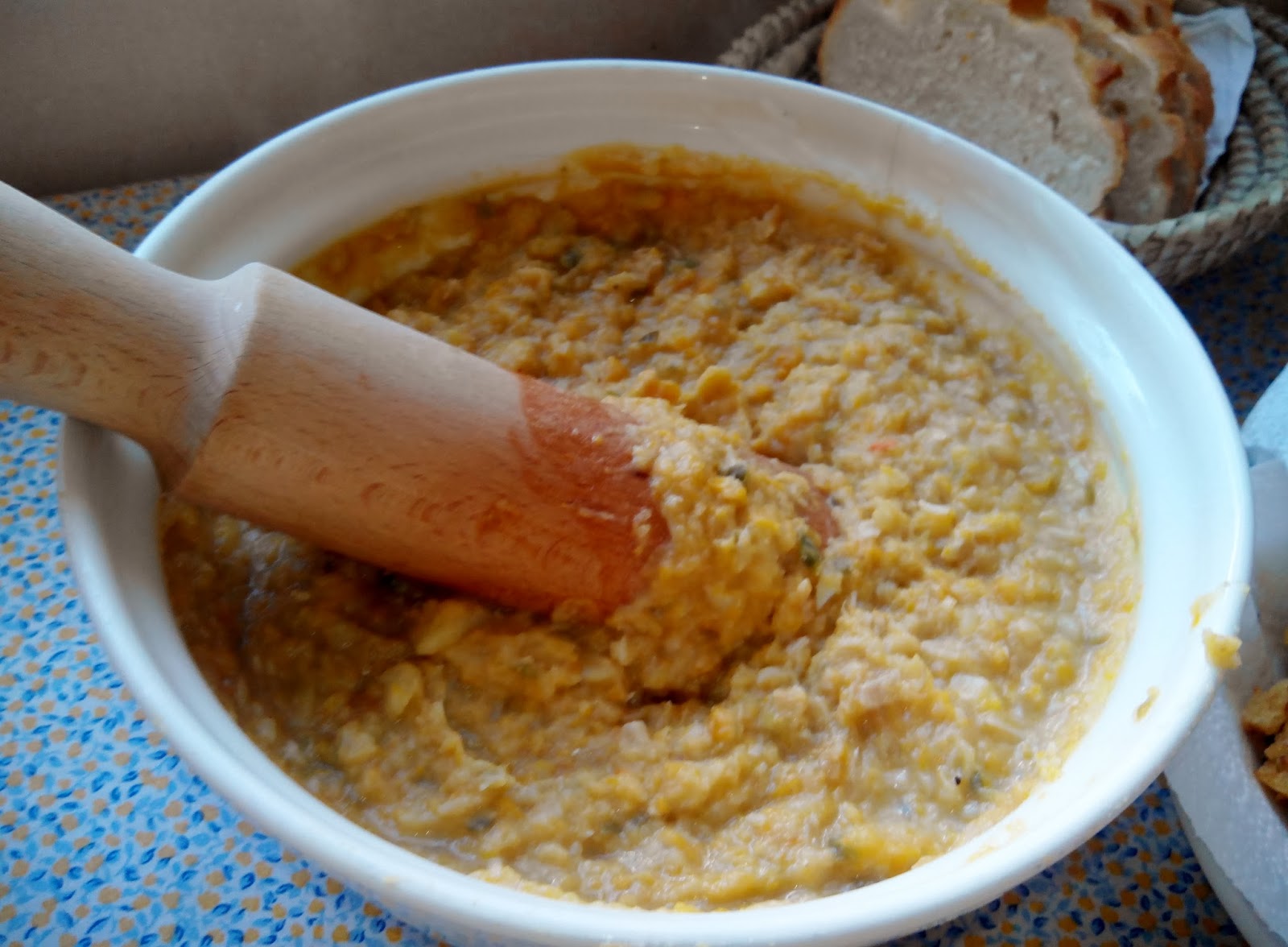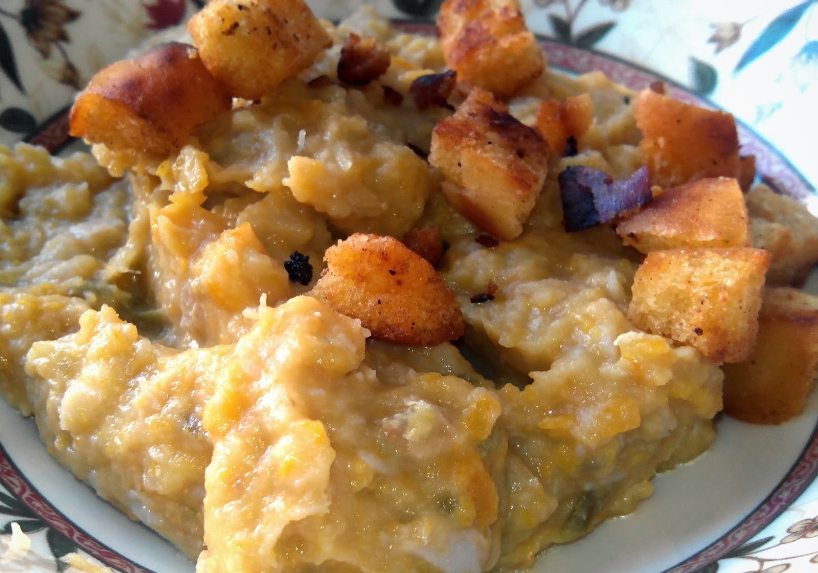 Así, al majado de bacalao y patatas le he añadido el sofrito de calabaza y pimiento y las nueces trituradas en una crema. Tenía un poco de miedo porque a veces los inventos no me salen muy allá, pero esta vez ha salido un plato con un sabor muy muy agradable. Vamos, que en casa tras el almuerzo no quedaron ni los restos. Para acompañarlo, freí unos costrones de pan con un poco de pimentón.