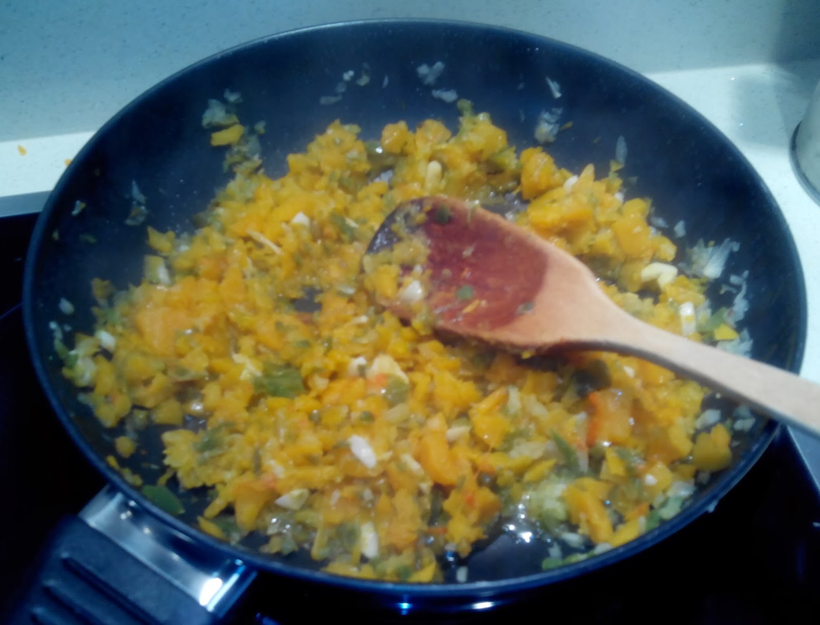 Pon las patatas y el bacalao en un lebrillo y machácalos con una maza. Añade un chorreón de aceite de oliva virgen y la sal que veas que necesite. Después, añade el sofrito de calabaza y vuelve a majar. Si el sofrito se ha enfriado, caliéntalo un poco antes. Prueba por si ves que necesita más sal o aceite. Una vez que tengas el gusto que quieres, añade un poco del caldo donde has hervido las patatas y el bacalao y remueve para darle una textura más ligera. Yo añadí unos tres cazos de servir sopa. Es importante que realices este paso justo antes de servir y con el agua a punto de ebullición, para que así el plato esté calentito.