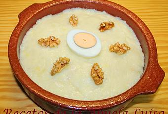 - Si tenemos que desalar el bacalao lo desalamos o bien podemos comprarlo ya desalado. - Cocemos las patatas sin pelar durante unos 30 minutos. - Por otra parte cocemos los huevos. - Y por otra parte cocemos el bacalao unos 5 minutos, reservamos el caldo de cocción. - Picamos los ajos, los ponemos en un recipiente donde podamos trabajar bien todo, machacamos los ajos con el mortero, añadimos las patatas peladas, vamos mezclando. - Añadimos el bacalao desmigado, seguimos mezclando bien. - Vamos incorporando el aceite poco a poco sin dejar de mezclar, si está espeso añadimos algo de caldo, vamos rectificando sazón. - Seguimos removiendo hasta que esté perfectamente mezclado (unos 10-15 minutos), ha de quedar con la consistencia de un puré. - Adornamos con el huevo cocido y con las nueces. - Servimos con un buen trozo de pan.