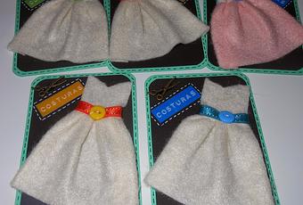 El vestido está compuesto de dos partes, la de arriba es un corte sencillo y la de abajo lleva unas costuras para que pueda verse con volumen y como si fuera un vestido real. En las costuras entre las dos piezas puse el lazo unido con un botón. Todo está cosido, de hecho el vestido no lleva pegamento, salvo el que lleva para unirlo a la tarjeta.