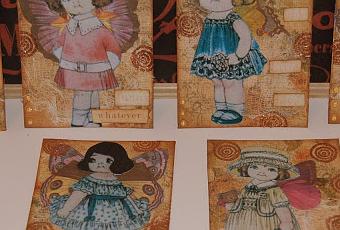 Con la cola y un pincel, fui pegando la gasa en la base de cada ATC. Cuando secó, pegué con cola las niñas a las bases presionando con un trapo para que se pegase bien y no quedasen bolsas de aire (sobre todo en las alas, pues el papel decoupage es muy finito).