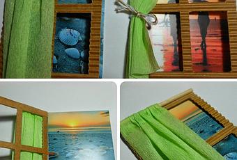El fondo de todos los atc (que fueron 8, la serie más grande que he hecho) es una foto de una playa, todos fueron diferentes, como había tanta playa preciosa, no me hizo falta repetir ninguna. La dificultad vino en intentar hacer una ventana, con bisagras y cortinas. La ventana no dio tanta guerra, fue cortar cartón corrugado con un patrón previamente hecho, luego hacer pequeñas bisagras y pegarlo a la foto.