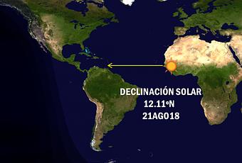 La declinación del Sol para ésta época del año, mantiene su avance aparente hacia el hemisferio Sur, y estará alcanzando los 0º el 23 de septiembre a las 01:40UTC. Ese día tendremos lo que se conoce como el equinoccio otoñal en el hemisferio Norte, llegando a su punto de menor latitud el 21 de diciembre cuando se ubicará en 23°45´ Latitud Sur. En ese "vaivén" del Sol (recordemos que quien produce dicha declinación es La Tierra) Venezuela es barrida por decirlo así, por esa declinación solar perpendicular y, desde hoy comenzará a incidir en los 12°11´34″N que es el punto más boreal continental de nuestro país, Cabo San Román, al Norte de la Península de Paraguaná, Estado Falcón. De allí que empezaremos a notar el incremento del calor los próximos días en las localidades donde no esté lloviendo o donde no haya una cobertura nubosa ampliada que nos proteja de ésta perpendicularidad de los rayos solares. Es precisamente durante éstos días y hasta finales de septiembre donde se han llegado a registrar los valores máximos de temperatura ambiental para el segundo semestre del año.