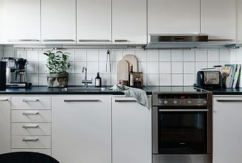 La cocina con los muebles blancos, es pequeña también pero muy coqueta totalmente equipada e incluso con espacio para mesa de comedor y una bonitas sillas de diseño. Y no podemos obviar la terraza que seguramente está bien aprovechada los días soleados nórdicos ¿verdad que os gusta? :)