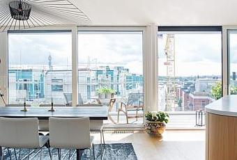 ¡Wow! ¿Os imagináis un ático así? yo ¡¡¡siii!!! No se que me gusta más si las vistas, los balcones que son prácticamente una prolongación de las habitaciones y del salón – comedor – cocina diáfanos, desde donde seguro, seguro se hacen los mejores postres del mundo :) el cuarto de baño con claraboya sobre la bañera, la decoración nórdica y ligera…