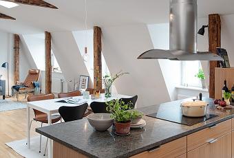 Empezamos la semana con un bonito ático loft sueco de 82 m² con vigas de madera vistas, techos inclinados y claraboyas. Muchos detalles de obra que nos gustan, desde el suelo de madera de roble, a la chimenea o la gran península de trabajo y desayunos en la cocina. El espacio diáfano que abarca la cocina, el comedor y el salón es cálido y acogedor, perfecto para la vida diaria de sus habitantes y para socializar con la familia y amigos. Pero sin duda una de las características que más me gustan de este ático es la lavandería integrada en el cuarto de baño, la perfecta alternativa a cuando no hay sitio suficiente para que esté separada en otra habitación. Tener la lavadora en el cuarto de baño, no sólo es más lógico que que esté en la cocina (como en muchos pisos españoles), sino más práctico y limpio. Para rematar, la calefacción por suelo radiante en el cuarto de baño también, otro elemento que ya debería venir de serie en todas las construcciones :). Espero que os guste, ¡feliz lunes!