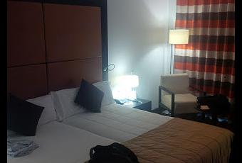 Dos camas blancas con dos almohadas cada una y vestidas con suaves sábanas blancas y unos asfixiantes nórdicos a cuadros. Sobre las almohadas, dos pequeños cojines marrones oscuros. A los pies de ambas camas hay un plaid marrón brillante. La cama está enmarcada en un cabecero de madera y piel color calabaza en forma de capitoné. En el marco de madera hay sendas lámparas de lectura dirigibles de aluminio. Una de ellas no funciona. A ambos lados de las camas, mesillas de madera sobre las que hay lámparas con pantalla de color crudo. En una de las mesillas está el teléfono y un bloc de notas y un lapicero pequeño. Sobre ambas, enchufes e interruptores para la luz. El juego de luces es agradable, pero los interruptores apagan "demasiadas" luces en cada toque y el juego sólo puede ser las mesillas, una lámpara de pie y una luz de techo siempre encendidas o siempre apagadas, pero en general la sensación es de calidez. Podría ser más si las paredes no estuvieran tan desnudas.
