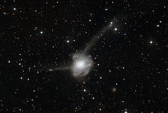 Átomos-por-la-Paz es el curioso nombre dado a un par de galaxias en interacción que se están fusionando, ubicadas a unos 220 millones de años-luz de distancia, en la constelación de Acuario. También es conocida como NGC 7252 y Arp 226 y posee el brillo suficientemente para ser observada por astrónomos aficionados como una pequeña mancha tenue y borrosa. Esta fotografía muy profunda fue producida por el instrumento Wide Field Imager de ESO en el telescopio MPG/ESO de 2,2 metros, en el Observatorio La Silla de ESO en Chile.