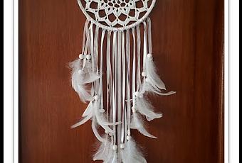 Este atrapasueños lo tenía preparado hace tiempo pero me faltaba montarlo en el aro y ponerle las cintas, bolas y plumas.Forré el aro con una puntilla blanca y le puse sujetado con el mismo hilo, el redondel de crochet.