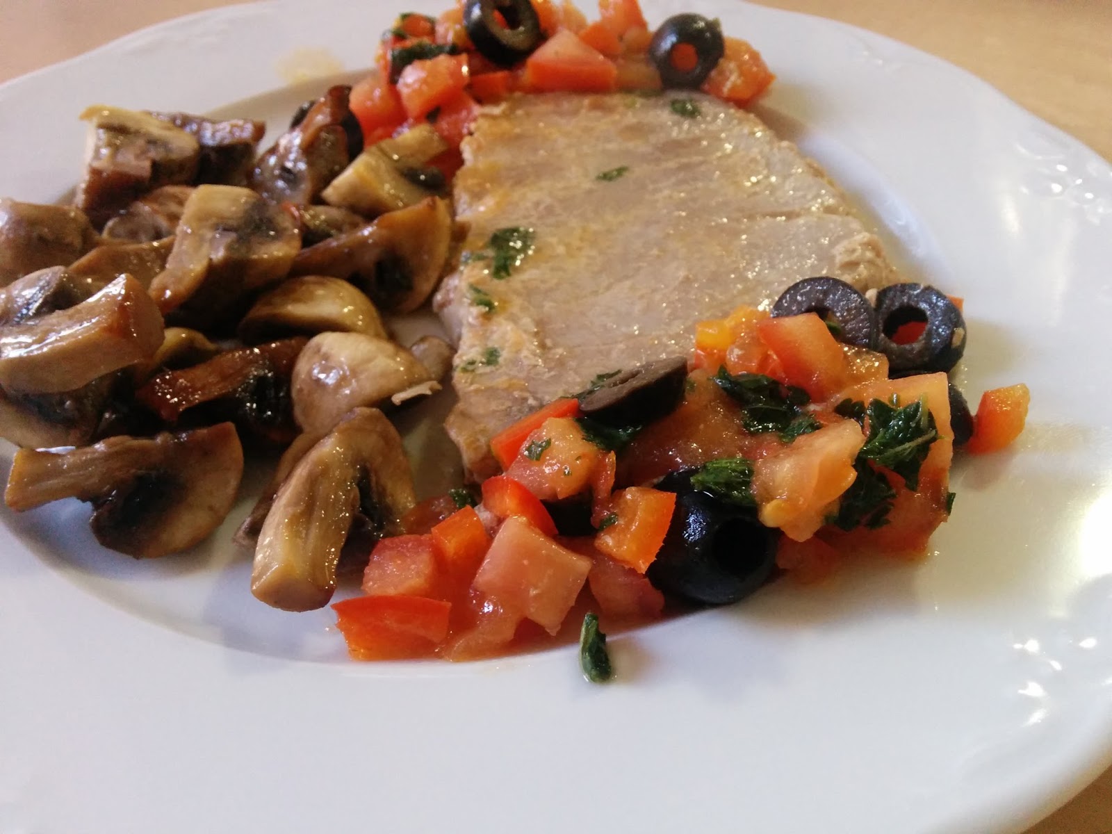 2 lomos de atún1 tomate grande12 aceitunas negras½ pimiento1 ramita de menta300gr de champiñones4 dientes de ajoAceiteSal