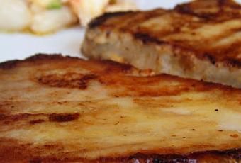 - Calentamos la plancha o sartén y la pincelamos generosamente con la vinagreta de mostaza.