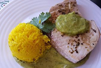 Hoy tengo una receta de atún blanco o barilote, el atún de las islas canarias. Una especie que habita en las aguas tropicales o aguas cálidas.Es un pescado rico en grasa omega-3 que ayuda a disminuir el colesterol malo y los triglicéridos en sangre.Rico en todo tipo de vitamina del grupo B, así como vitamina A y D. Además es rico en hierro. Por lo que se recomiendo comer una vez a la semana.El atún de hoy es salteado con ajo y acompañado con una rica salsa de mojo de aguacate y un arroz con curcuma y tomillo. Una fabulosa combinación de sabores que lo convierten en un exquisito manjar.