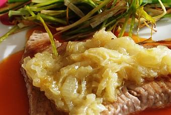 Para servir, poner unas cucharadas de salsa agridulce en el plato, colocar el lomo de atún encima y la cebolla confitada encima del pescado. Acompañar del puerro y servir.