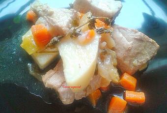 INGREDIENTES: 1 cebolla bien hermosa cortada en gajos, 1 puerro en rodajas, un ajo picado, perejil fresco también picado, tomillo fresco, medio kilo de atún, 2 papas grandes en tacos, vaso y medio de agua, 1 vaso hermoso de vino blanco, 2 zanahorias en tacos pequeños, sal y aceite.