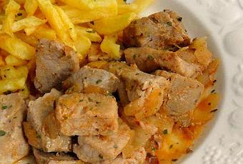 - Cuando la cebolla esté transparente, añadir ½ kg. de atún a tacos (ligeramente enjuagado). Salpimentar, añadir orégano y un poco de pimentón dulce, dar unas vueltas y añadir un chorreón de vinagre. Dejar que hierva y retirar enseguida (si está mucho tiempo, se queda muy seco el atún).