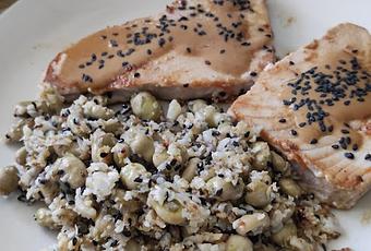 Servir en los platos el arroz salteado con las habitas y colocar, el lomo de atún pintado con el glaseado de lima, hoisin y sésamo, y terminar con unas escamas de sal y más sésamo.