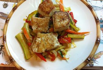 Se sirve espolvoreado con escamas de sal sobre el lecho de verduritas y salseado con un toque de salsa de soja.