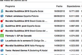 Leo en FormulaTv.com los datos de audiencia del mes de junio y compruebo que de los diz programas más vistos, ocho son deportes. Esto es algo que puede tener relación directa con un mes cargado de acontecimientos importantes como el Mundial de Fútbol, Roland Garros, la Fórmula 1 y MotoGP. Aunque de hecho, tradicionalmente los grandes eventos como finales o clasificaciones siempre han sido los que han obtenido récords de audiencia.