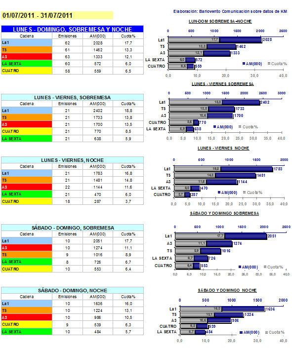 Como segunda opción, se coloca Telecinco. Le distancia del liderazgo una media de 566.000 espectadores. Antena 3 se coloca como segunda opción aunque solo si se tiene en cuenta las sobremesas de los fines de semana, ya que en días laborables es tercera. laSexta supera a Cuatro con una diferencia de 13.000 espectadores.