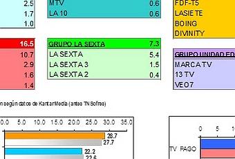 6.- laSexta (5,4%) baja una décimalaSexta (5,4%) baja por tercer mes consecutivo, en esta ocasión una décima con pérdidas sobre todo en mujeres, espectadores menores de 44 años, jornadas laborables y franjas de tarde y “prime-time”. La “Fórmula 1” vuelve a ser lo más seguido de la cadena en el mes, con el Gran Premio de Hungría en cabeza con más de 4.200.000 espectadores de audiencia media y un 39,4% de cuota de pantalla.