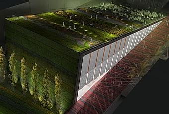El parque inclinado combina áreas de vegetación autóctona con graderíos y zonas verdes ordenadas mediante bandas. Es tanto una plaza como un auditorio al aire libre y eventualmente un lugar donde reunirse para asociaciones o pequeños espectáculos. Todas las especies seleccionadas para la cubierta vegetal serán autóctonas o de mantenimiento mínimo (sedum y crassulaceas). Una lámina de agua que contribuye al enfriamiento del entorno por evapotranspiración y evidencia el sistema de recogida d aguas pluviales de la cubierta.