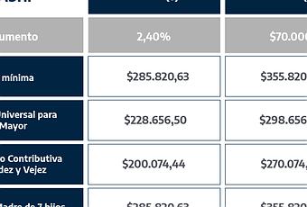 La Pensión Universal para el Adulto Mayor (PUAM) se incrementará a 298.656,50 pesos, compuestos por 228.656,50 pesos de haber con aumento y el bono de 70.000 pesos. Por su parte, las Pensiones No Contributivas (PNC) por Invalidez y Vejez serán de 270.074,44 pesos, resultantes de 200.074,44 pesos de haber con aumento más el bono de 70.000 pesos.